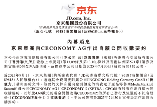 9月1日,京东集团宣布,将通过其全资间接附属公司JINGDONG Holding Germany GmbH发布要约文件。该要约文件有关向欧洲领先的消费电子产品零售商MediaMarkt及Saturn的母公司CECONOMY AG所有股东作出自愿公开收购要约,以每股4.60欧元的现金对价收购CECONOMY的所有已发行及流通的不记名股份。