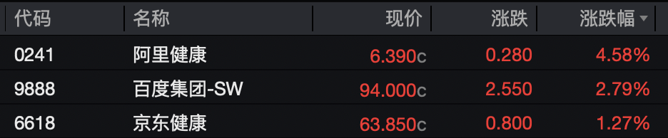 阿里健康、百度集团和京东健康分别上涨了4.58%、2.79%、1.27%。