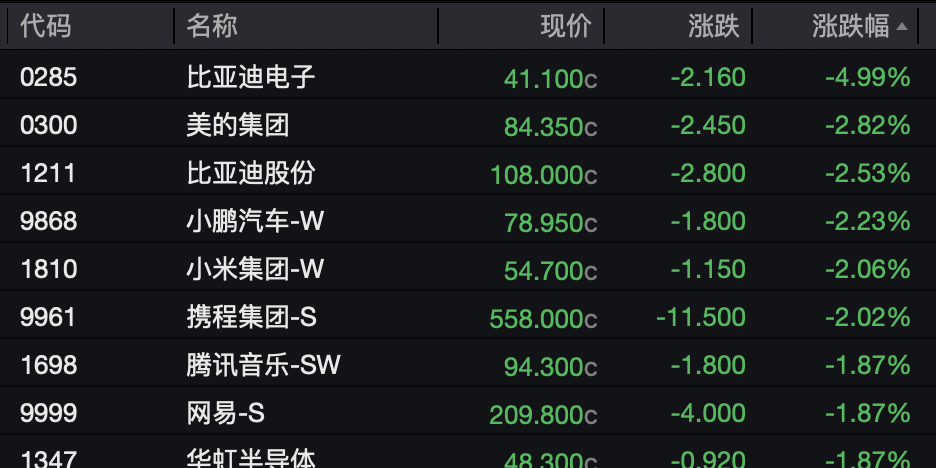 恒生科技指数成分股比亚迪(002594)电子、美的集团(000333)、小鹏汽车、小米集团和携程集团等分别下跌4.99%、2.82%、2.23%、2.06%、2.02%。