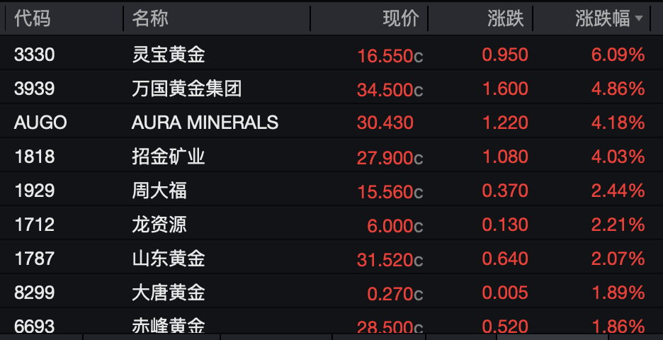 黄金股万国黄金、招金矿业和山东黄金(600547)等分别上涨4.86%、4.03%、2.07%。珠宝股周大福上涨2.44%。