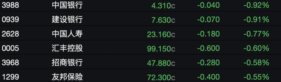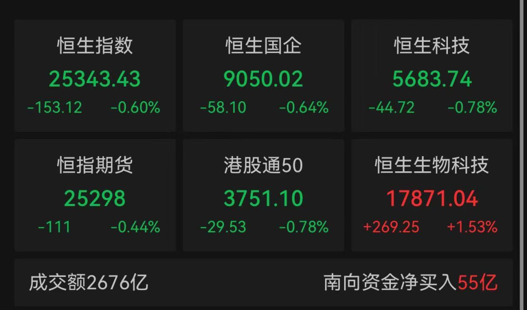 三大指数收跌,恒生科技指数成分股普跌