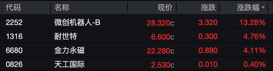 机器人概念股微创机器人涨超13%