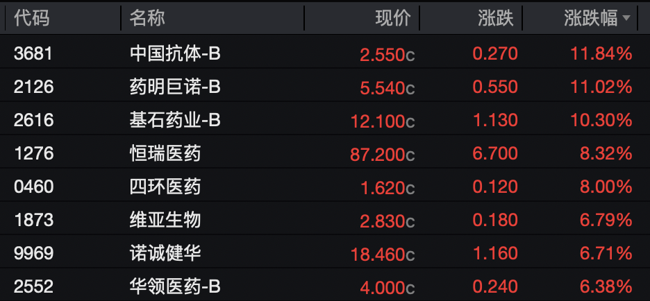 B类股中国抗体、药明巨诺和基石药业均涨超10%。恒瑞医药(600276)、四环医药、维亚生物等个股涨幅分别达到了8.32%、8.00%、6.79%。