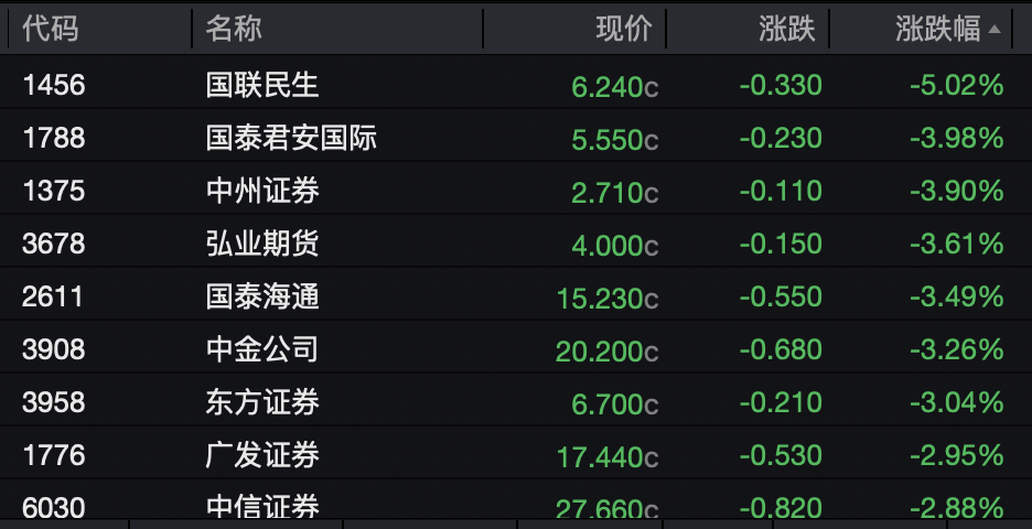 国联民生(601456)领跌5.02%,国泰君安国际、中州证券、国泰海通等均收跌。