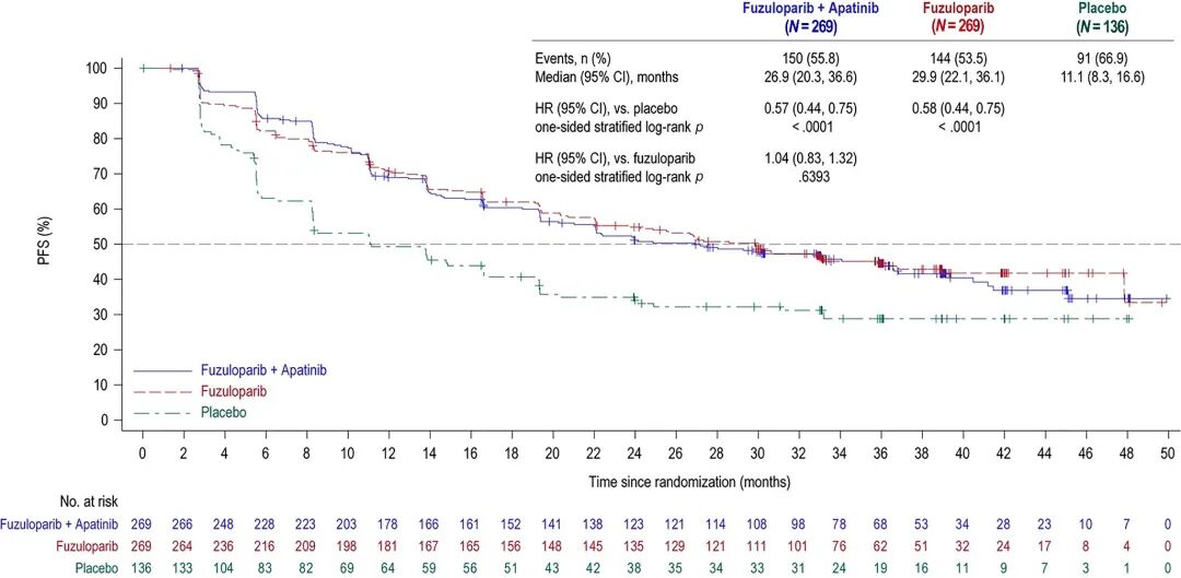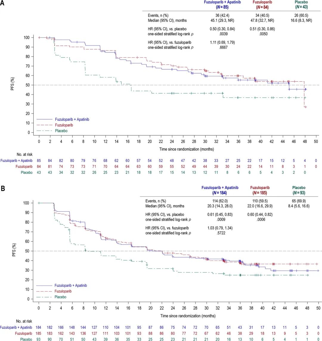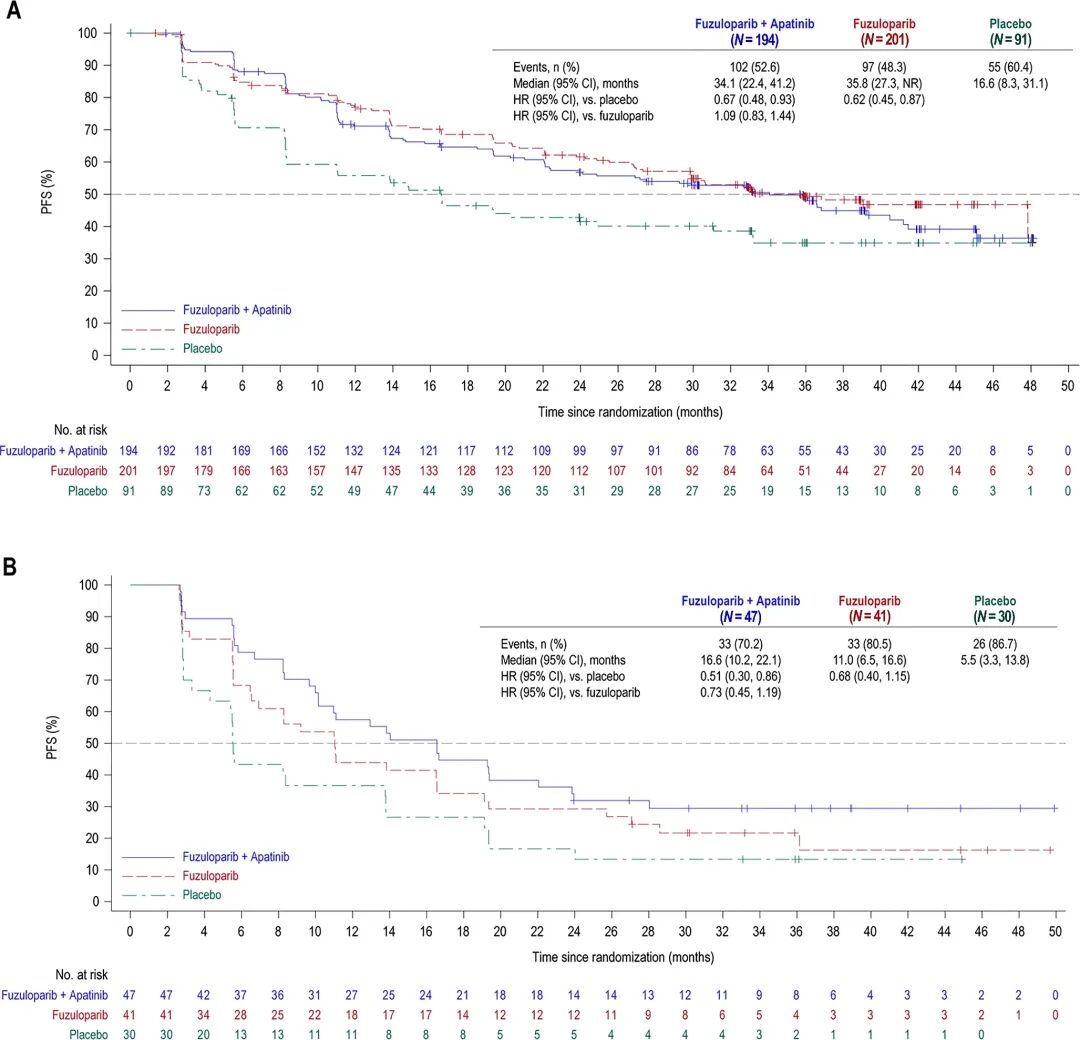 FZPL组的中位治疗持续时间为23.9个月(范围:0.1~49.7个月),安慰剂组为14.6个月(范围:0.03~39.6个月)。联合治疗组中,氟唑帕利的中位治疗持续时间为23.7个月(范围:0.2~50.0个月),阿帕替尼的中位治疗持续时间为18.3个月(范围:0.2~50.0个月)。