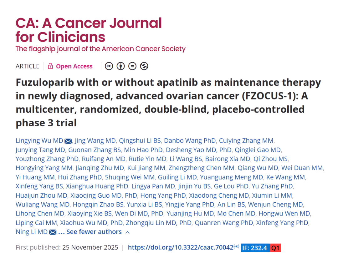 2025年11月25日,恒瑞医药(600276)自主研发的创新药氟唑帕利联合阿帕替尼或氟唑帕利单药用于新诊断晚期卵巢癌(OC)的一线维持治疗研究最新数据(FZOCUS-1研究)重磅在线发表于国际顶尖医学期刊《临床医师癌症杂志》(A Cancer Journal for Clinicians,简称CA,2024年影响因子高达232.4)1。