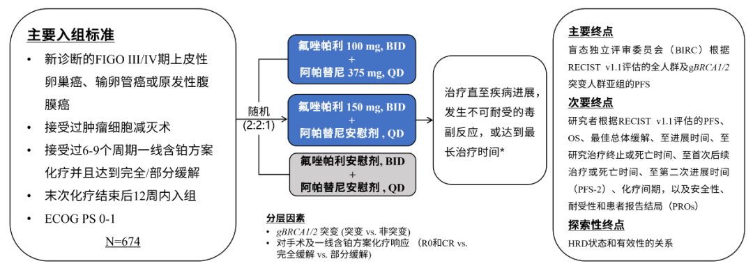 2020年8月27日至2022年4月1日期间,674例患者被纳入研究并按2:2:1的比例随机分配至FZPL+APA组(n=269):氟唑帕利(100 mg BID)+阿帕替尼(375 mg QD)、FZPL组(n=269):氟唑帕利(150 mg BID)或安慰剂组(n=136)进行维持治疗。