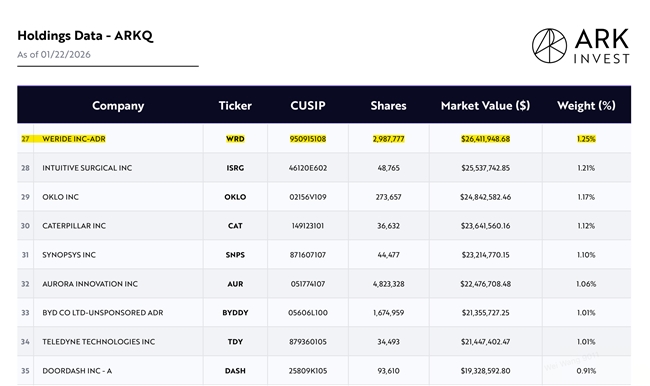 近日,知名投资人凯西.伍德(Cathie Wood)旗下ARK Invest对自动驾驶科技企业文远知行WeRide(WRD.US、0800.HK)的持续增持动作引发行业关注。据ARK Invest公开披露信息显示,自2025年12月起,该机构便开启对文远知行的加仓进程,截至2026年1月22日,其旗下Autonomous Technology&Robotics ETF已累计持有文远知行近300万份ADR,对应市值约3000万美元,按持仓股数计算,文远知行已跻身该基金投资标的前五名。