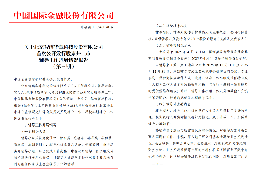 近日,中国证监会官网更新了智谱(HK2513)公司的IPO辅导进展信息。根据公告,其辅导机构中金公司(601995)已递交了智谱(HK2513)的第三期IPO辅导工作进展情况报告(下称“辅导报告”),落款日期为2026年1月15日。