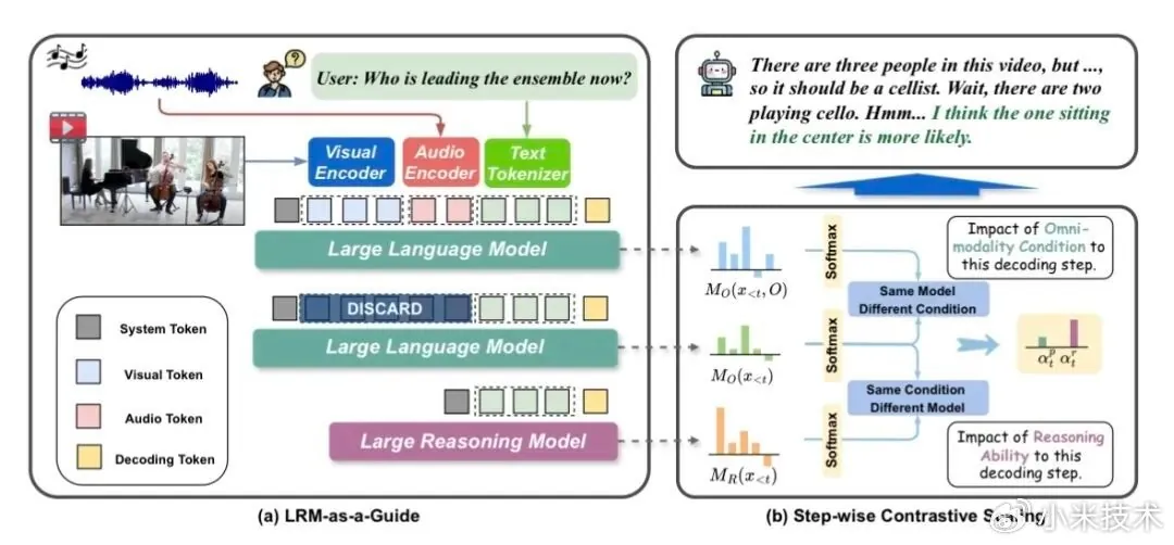 该框架包含两大核心组件:LRM-as-a-Guide(利用现成的推理大模型来指导 OLLM 的解码过程,实现“借智推理”)、Stepwise Contrastive Scaling(自适应地平衡感知信号与推理信号),实现“感知基础与推理深度的动态平衡”。ThinkOmni 在六个多模态推理基准上均展现出一致的性能提升,为推理能力的泛化应用提供了全新思路。