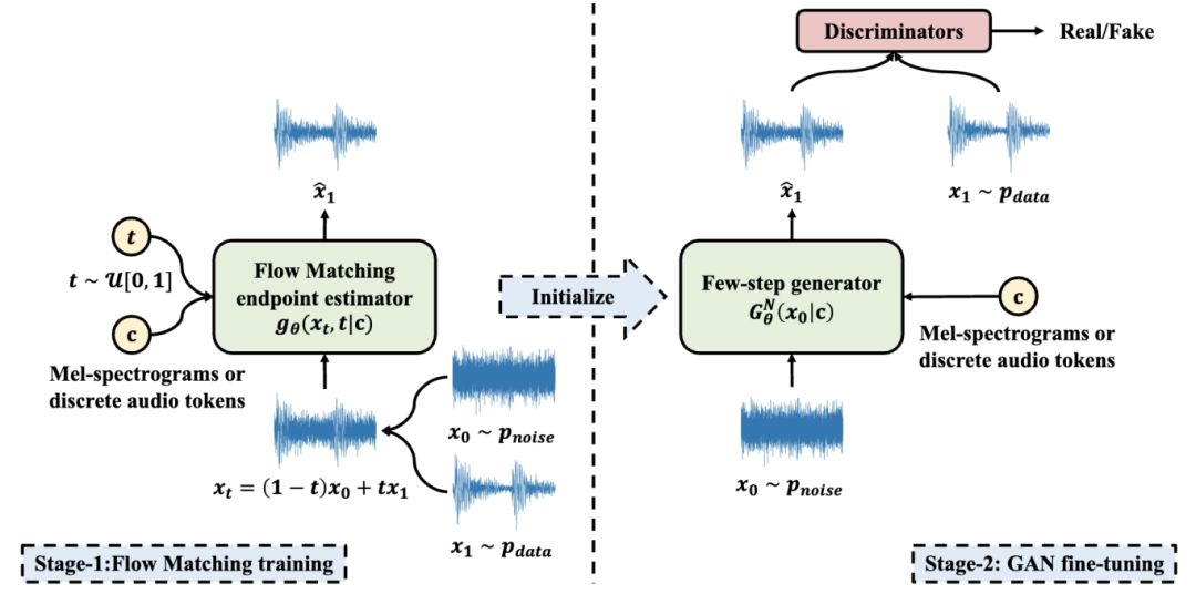 现有主流的音频生成方法主要包括生成对抗网络 (GAN) 以及基于扩散的生成方法 (如 Flow Matching)。其中,GAN 在训练过程中往往存在收敛缓慢的问题,而扩散类方法在推理阶段通常需要多步采样,带来较大的计算开销。