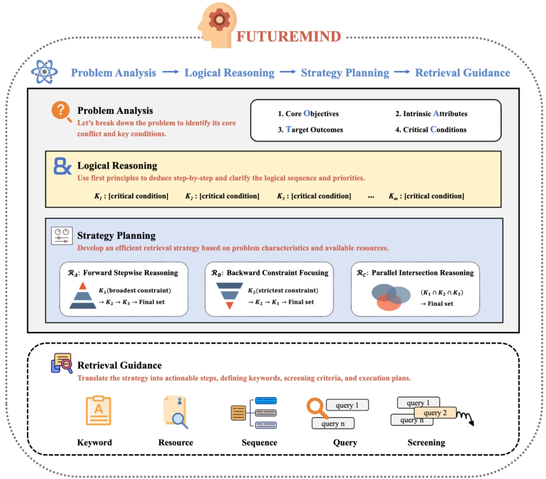 FutureMind 通过自适应知识蒸馏,从大型语言模型(LLMs)中提炼出高级认知能力,包括问题分析、条件排序、策略规划及检索决策等思维先验,构建了由问题分析、逻辑推理、策略规划与检索指导模块组成的动态推理流水线。该流水线辅以三种不同的检索范式(前向、反向及并行检索策略),有效拆解复杂查询,显著减少无效调用和冗余检索,极大提升了推理效率与检索准确率。