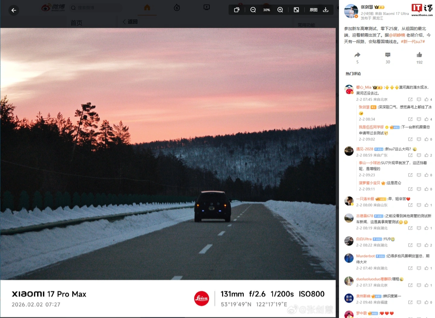 IT之家注意到,小米集团副总裁、采购委员会主席、资产与工程管理部总经理张剑慧也在微博透露了新车进展。其分享的图片展示了汽车动态情况,可以看到小蓝灯点亮上车。