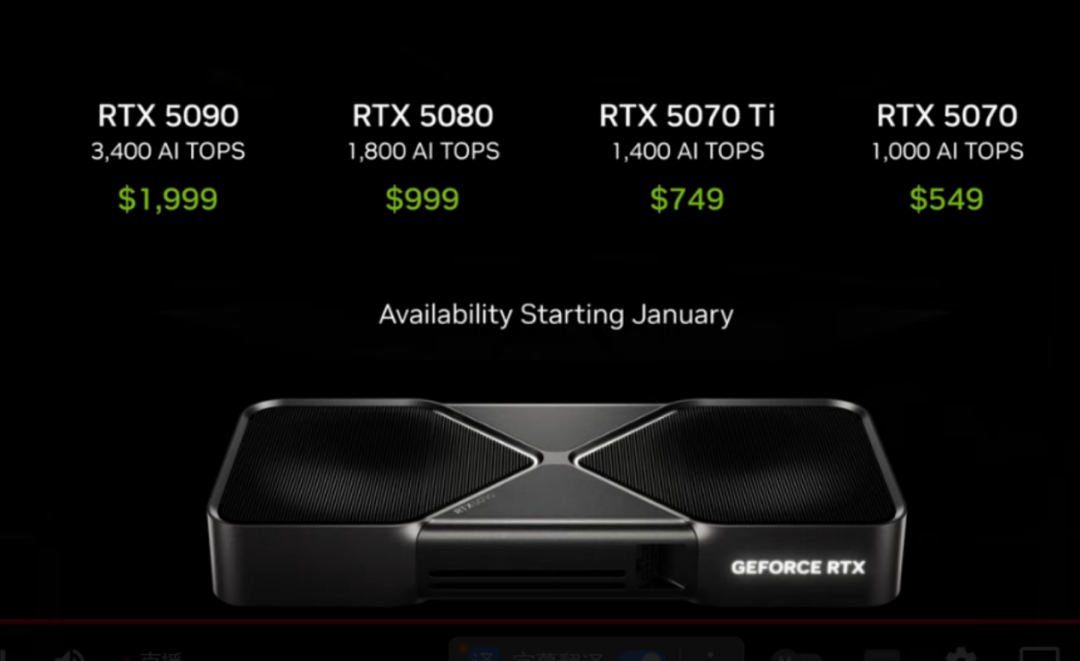 售价方面,RTX 8050、RTX 5070 Ti和RTX 5070的售价分别为999美元、749美元和549美元,RTX 5090的价格为1999美元。黄仁勋称,售价549美元的RTX 5070将提供与此前售价1599美元的RTX 4090相同的性能。
