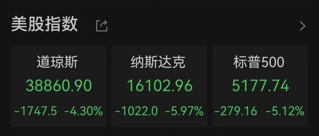 4月10日晚间,美股又上演暴跌行情。截至发稿,道指跌超1700点,纳指跌近6%,标普500指数跌超5%。