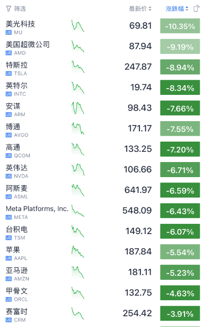 科技巨头中,特斯拉跌约9%,英伟达跌超6%,苹果跌超5%。