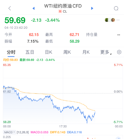 4月10日晚间,国际油价继续暴跌,美国原油在最新交易中下跌超过3%,至每桶59.69美元。这意味着油价几乎回吐了周三的全部涨幅。