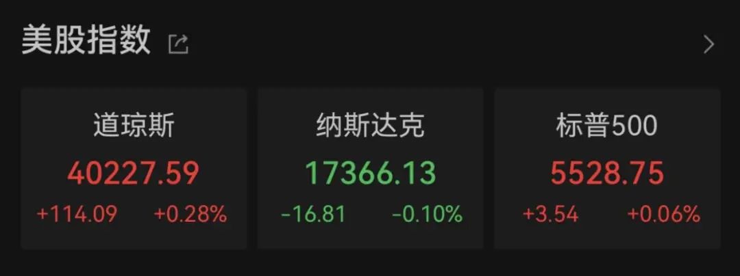道指涨114.09点,涨幅为0.28%,报40227.59点;纳指跌16.81点,跌幅为0.10%,报17366.13点;标普500指数涨3.54点,涨幅为0.06%,报5528.75点。