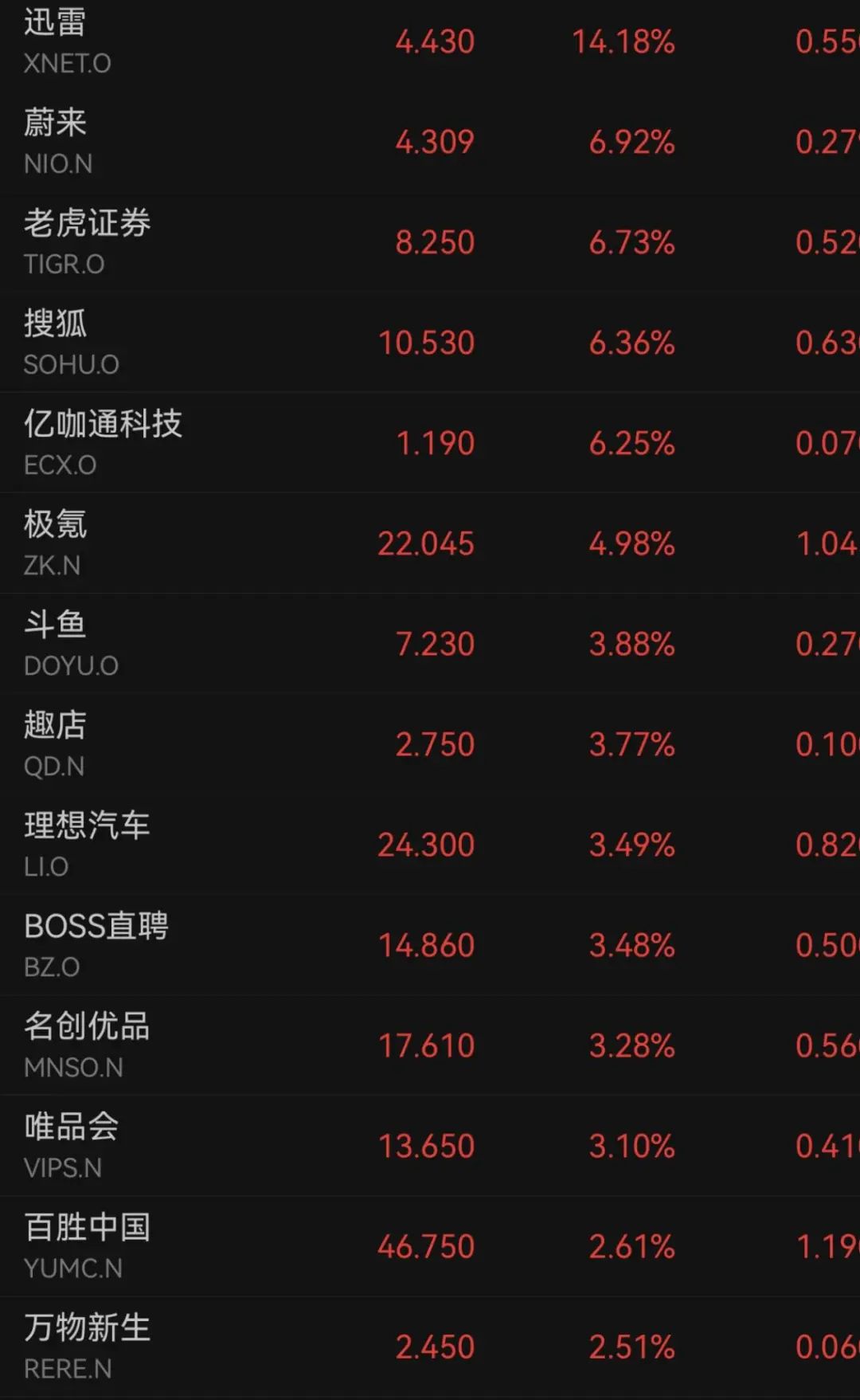 热门中概股多数上涨,纳斯达克中国金龙指数涨0.68%。迅雷涨超14%,蔚来、搜狐涨超6%,斗鱼、理想汽车、BOSS直聘、名创优品涨超3%,百胜中国、万物新生涨超2%。