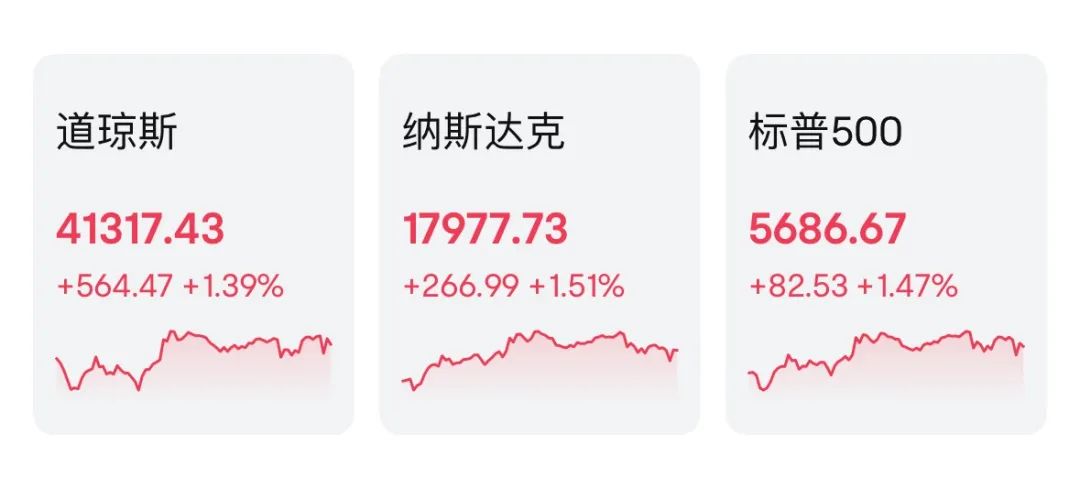 截至收盘,道指涨1.39%,报41317.43点;标普500指数涨1.47%,报5686.67点;纳指涨1.51%,报17977.73点。其中,道指、标普500指数均录得九连涨,标普500指数创2004年以来最长连涨纪录。