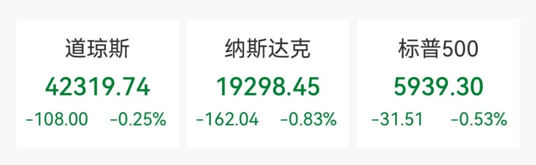 截至收盘,道琼斯指数跌0.25%,报42319.74点;标普500指数跌0.53%,报5939.30点;纳斯达克指数跌0.83%,报19298.45点。