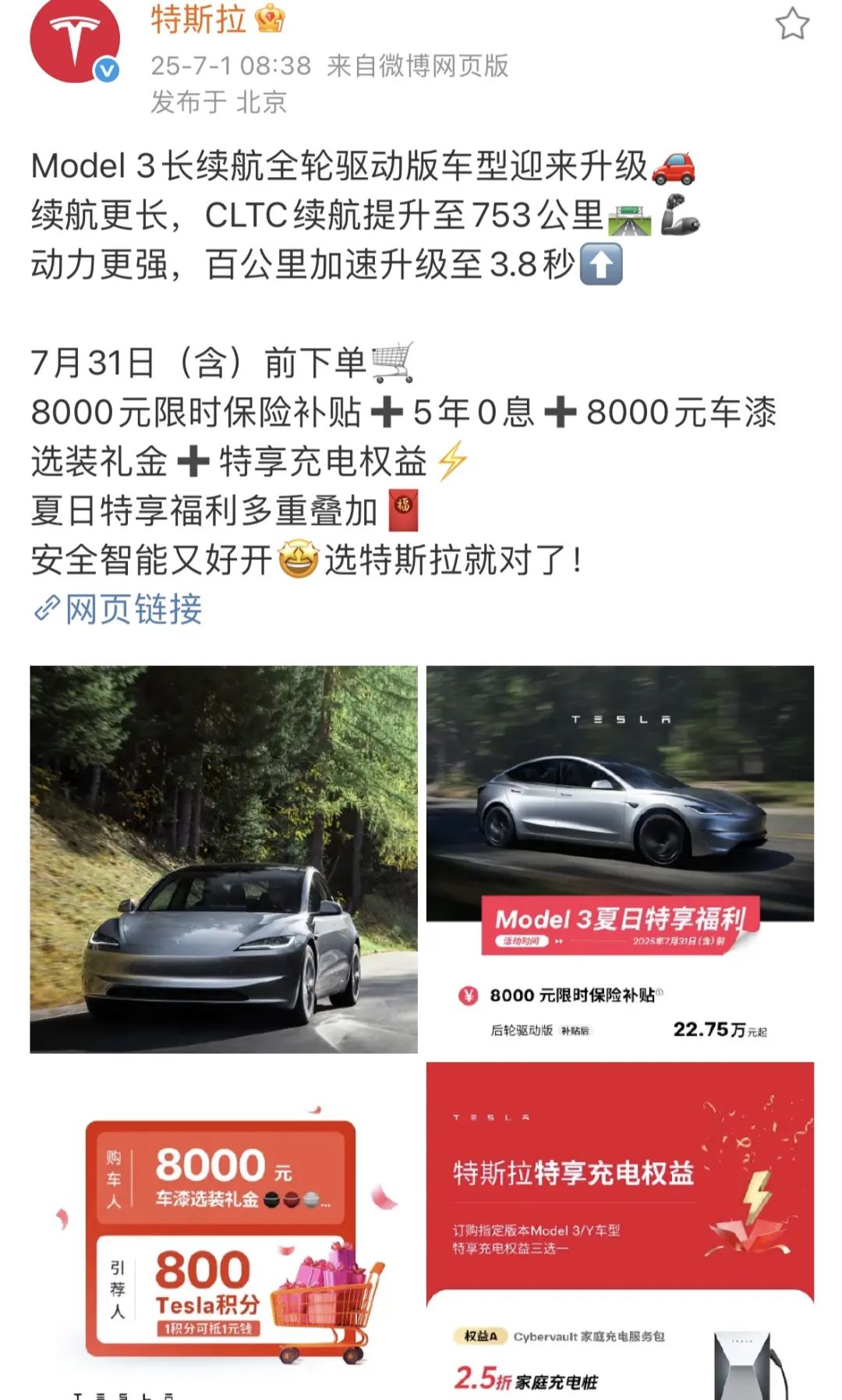 另外,特斯拉延续了购车补贴政策,7月31日前下单,叠加“5年0息”“8000元保险补贴(限Model3车型)”“8000元车漆选装礼金”“1299元特享充电权益”等政策。