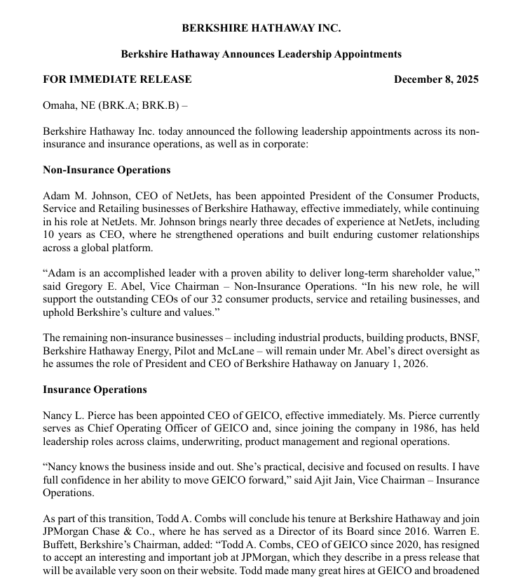 其余非保险业务——包括工业产品、建筑材料、BNSF铁路、伯克希尔哈撒韦能源、Pilot旅行中心和McLane供应链服务——在格雷格·阿贝尔于2026年1月1日接任伯克希尔首席执行官后,将继续由其直接领导。