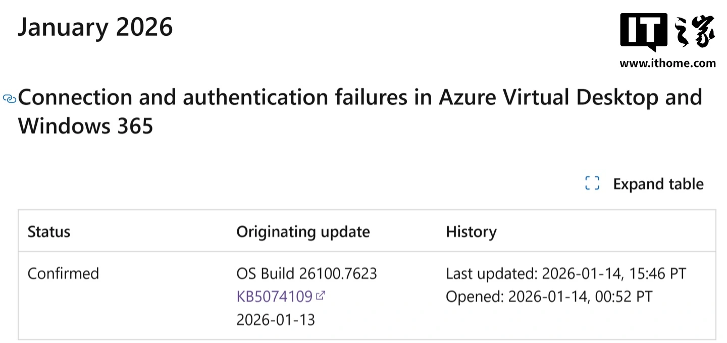 IT之家 1 月 15 日消息,微软昨日(1 月 14 日)更新 Windows 版本运行状况仪表板,承认 2026 年 1 月累积更新 KB5074109 存在 BUG,导致部分 Windows 11 和 Windows Server 用户无法正常使用远程桌面功能。
