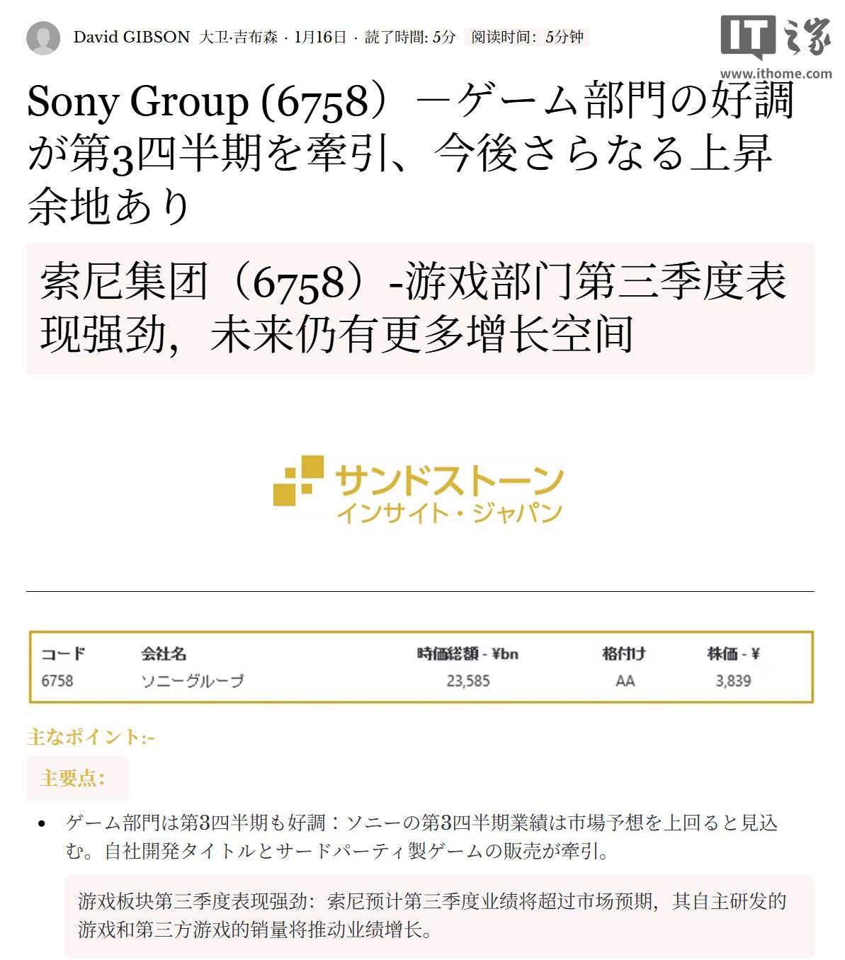 Gibson 指出,索尼 2025 财年第三季度的表现超出预期,其中游戏、网络服务持续强劲增长,预计第三季度的销售额可达 1.8 万亿日元(IT之家注:现汇率约合 792.34 亿元人民币),营业利润为 1600 亿日元(现汇率约合 70.43 亿元人民币)。