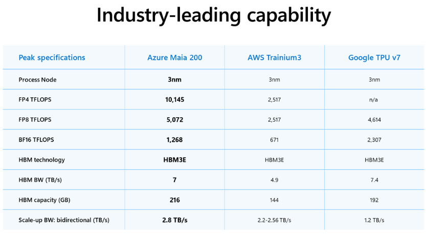 继谷歌与亚马逊近期纷纷发布新一代性能大幅升级的云计算平台内部专属AI ASIC芯片之后,同为全球云计算“三巨头”的微软传闻已久的Maia 200 新一代高性能AI芯片产品终于问世。