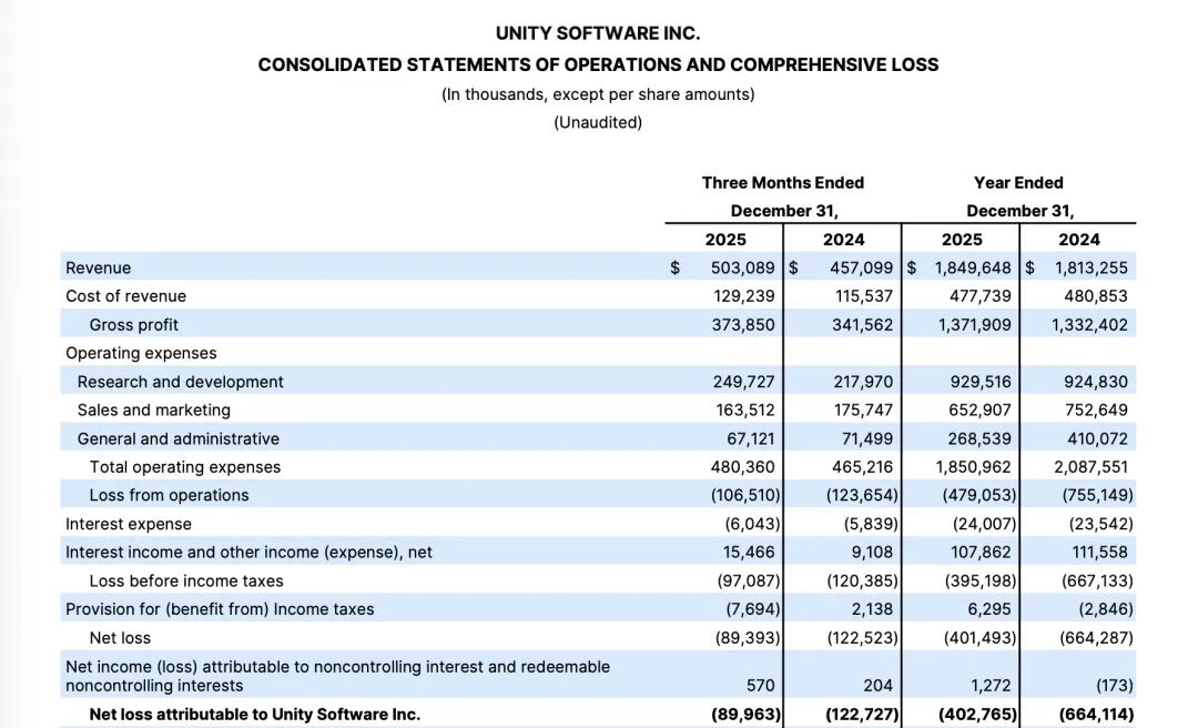 2月11日美股盘前,Unity披露了最新财报。2025年全年,Unity营收18.5亿美元,同比微增2.04%;归母净亏损由2024年的6.64亿美收窄至4.03亿美元。